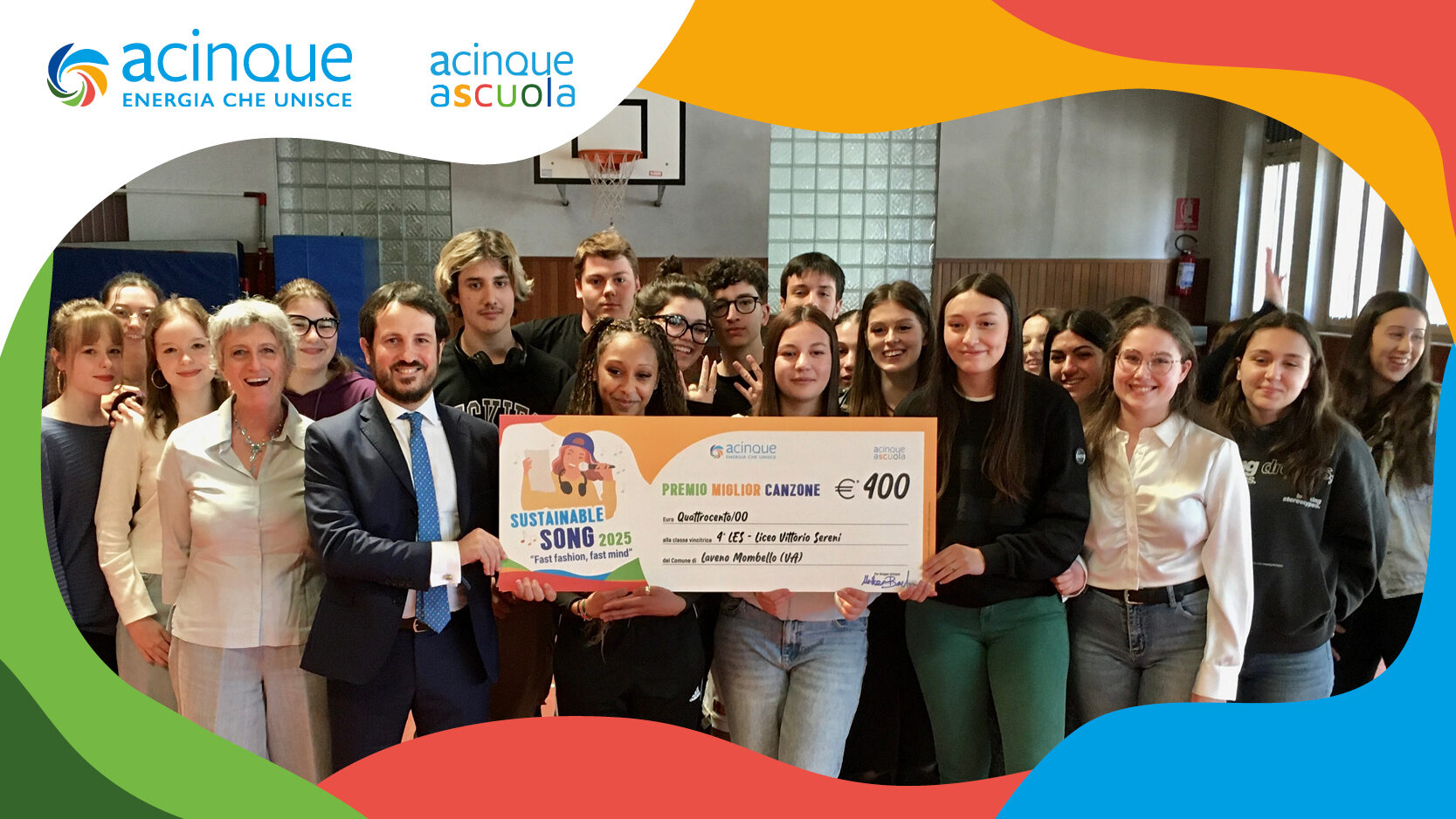 La Sustainable Song 2025 di Acinque a Scuola è Fast fashion, fast mind, 4^LES Liceo Vittorio Sereni sede di Laveno Mombello (VA), premiata dal presidente del gruppo Acinque, Matteo Barbera: “Il tema scelto che è davvero sentito, il modo di raccontarlo contemporaneo ed efficace e la componente artistica sono stati fattori determinanti per la vittoria”.