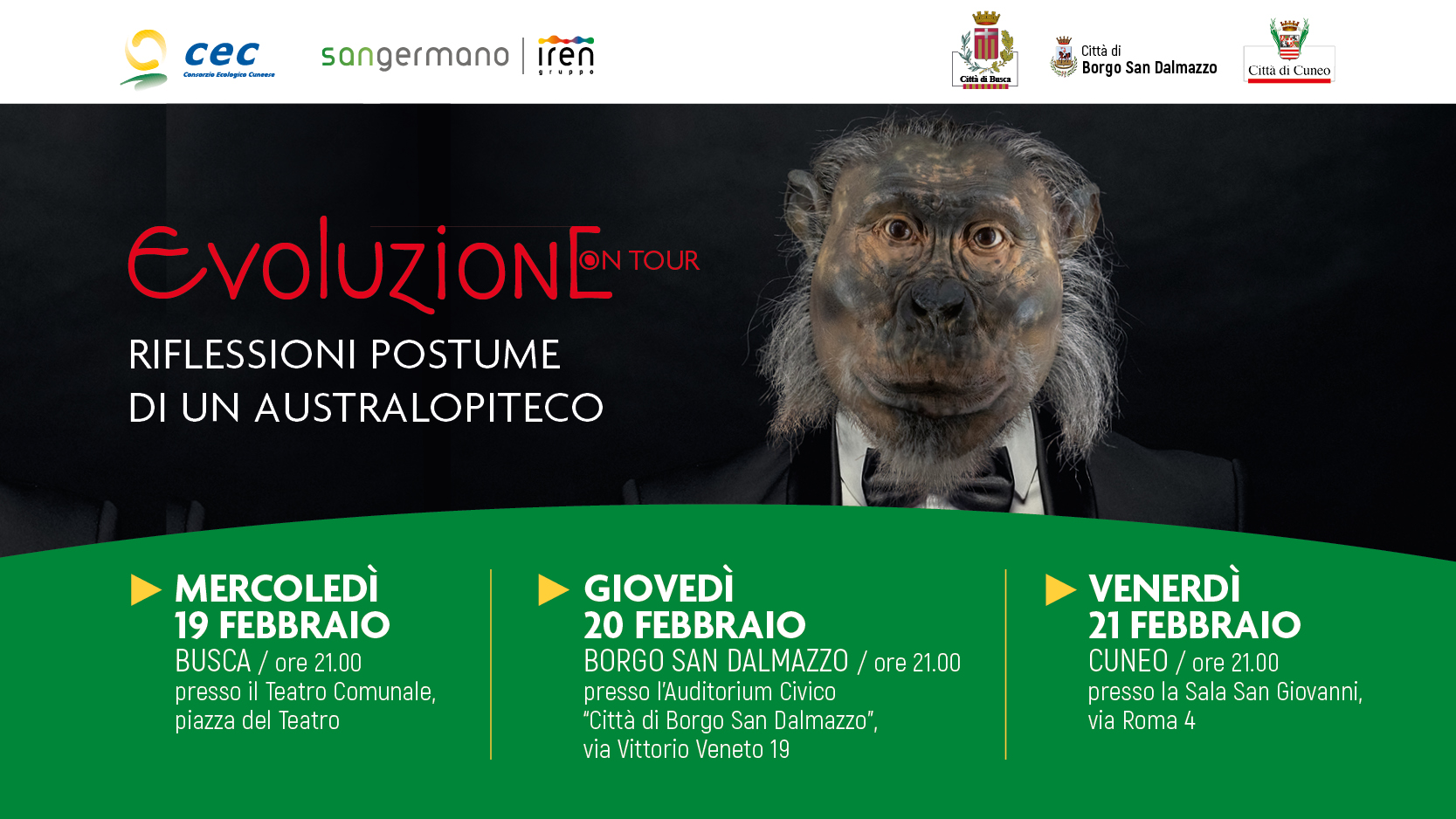 “Evoluzione, riflessioni postume di un australopiteco” è il titolo del monologo teatrale che il Consorzio Ecologico Cuneese e San Germano Iren, in collaborazione con i comuni di Borgo San Dalmazzo, Busca e Cuneo, portano in scena gratuitamente per un tour di 3 giorni consecutivi nel mese di febbraio.