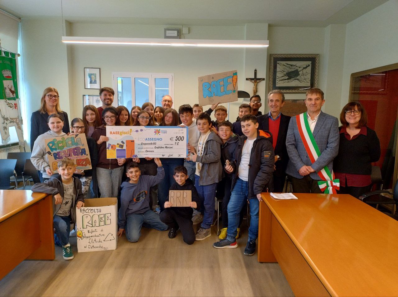 - RAEEgisci! La miglior campagna di comunicazione categoria “Secondarie di I grado”: scuola di Cervasca. La classe 1ªC di Cervasca, coordinata dal Prof. Samuele Galli, ha realizzato uno splendido e innovativo videoclip promozionale per incentivare la raccolta dei RAEE sul territorio. La cerimonia si è svolta in Sala Consiliare alla presenza del Sindaco Enzo Garnerone, dell’Assessore Silvano Rinaudo, della Dirigente dell’IC Cervasca Cristina Bersani e del Presidente Quiriti. GUARDA IL VIDEO!