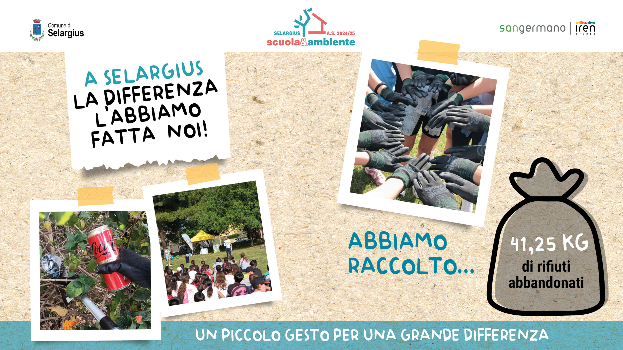 Il percorso si è concluso con un gesto concreto e collettivo: lo scorso 23 maggio, al Parco Lineare di Selargius, si è svolto un Clean Up Day con la partecipazione di 20 classi e oltre 350 alunni e alunne. Armati di guanti, pinze e sacchi, i giovani “ecoguerrieri” hanno ripulito l’area raccogliendo più di 41 kg di rifiuti abbandonati.